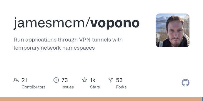 vopono é uma ferramenta para rodar aplicações através de túneis VPN usando namespaces de rede temporários. Isso permite rodar apenas alguns aplicativos com diferentes VPNs simultaneamente, mantendo a conexão principal normal.