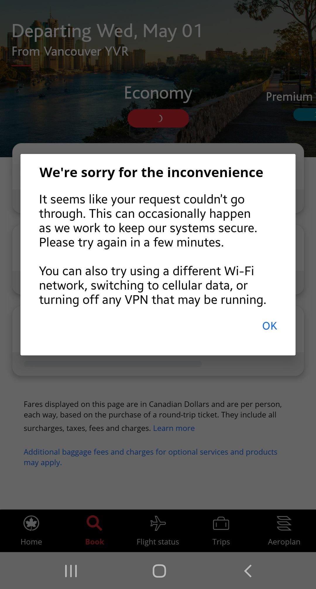 O app da Air Canada que começou a apresentar hoje não está deixando fazer buscas normais de voos ou buscas de milhas com mensagem de erro dizendo que estou usando uma VPN. Isso ocorre no Android S23.