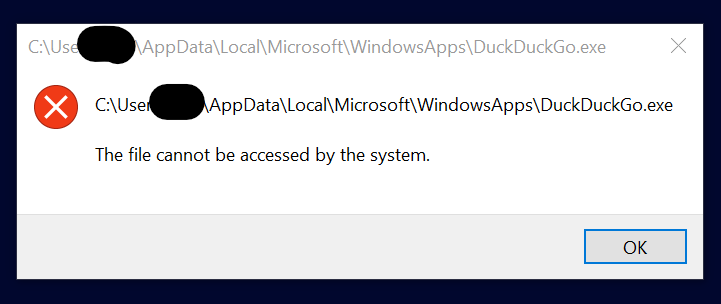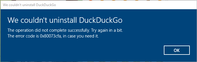 (Se você, DDG, estiver lendo, uso Windows 10 Pro totalmente atualizado em um laptop e a versão mais recente do DDG. Quando tento desinstalar, recebo o erro 0x80073cfa. Quando tento instalar pelo seu site, usando os navegadores Firefox, Edge e Chrome, aparece a mensagem: “Por favor, entre em contato com seu vendedor de software.” Isso é você, DDG!)